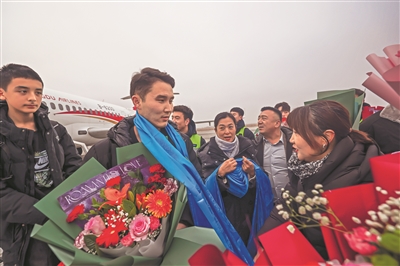本报博乐讯 (记者于苏甫·艾尼) 11月30日11时50分,参加2025年“阿图什杯”足球邀请赛的博州帕丽迪澳队(以下简称“博州队”)队员抵达博乐阿拉山口机场,众多球迷自发前来迎接家乡足球健儿凯旋。