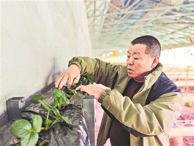 ◀ 1月5日,在博乐市贝林哈日莫墩乡决肯村草莓大棚内,种植户察看草莓长势。