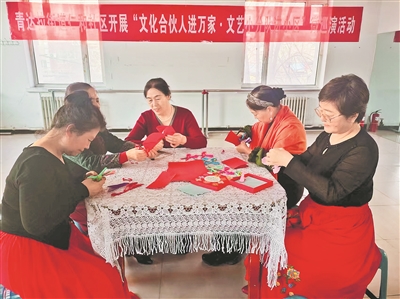 1月17日,文化合伙人、剪纸艺人何香兰(左三)讲解剪纸技巧。