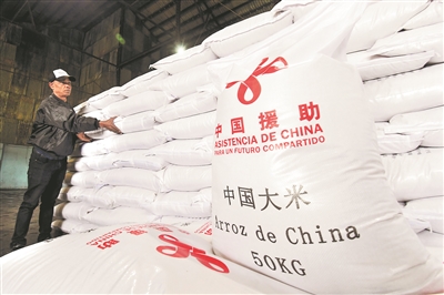 1月19日,在古巴首都哈瓦那,工作人员码放中国援助的大米。