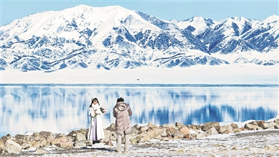1月20日,赛里木湖风景名胜区内,游客拍照留念。