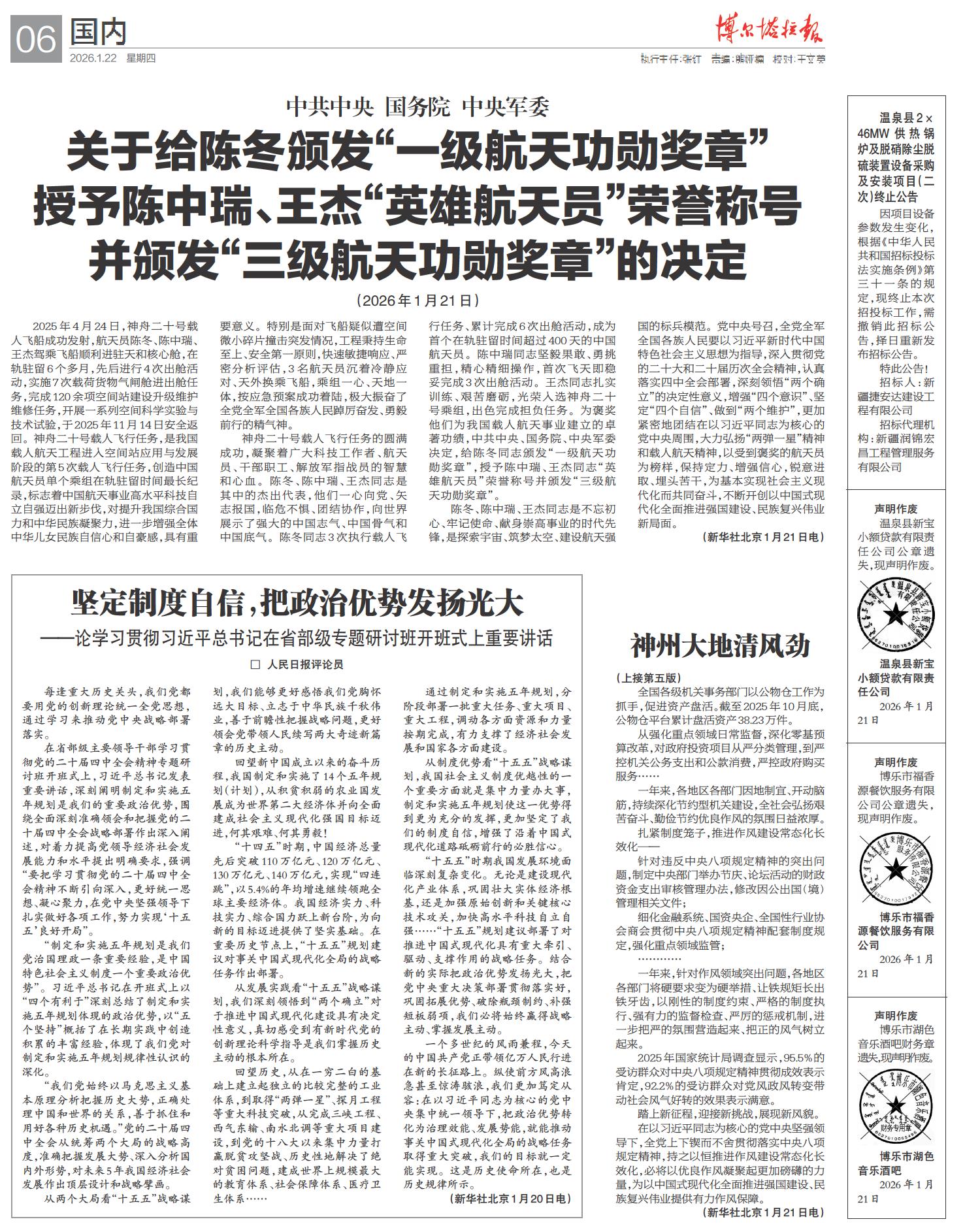 关于给陈冬颁发“一级航天功勋奖章”授予陈中瑞、王杰“英雄航天员”荣誉称号并颁发“三级航天功勋奖章”的决定