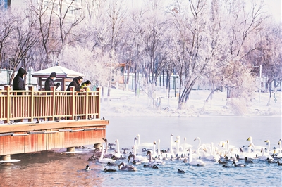 在滨河公园过冬的天鹅时而展翅、时而戏水,与玉树琼枝相映成趣,构成一幅动人的冬日画卷。