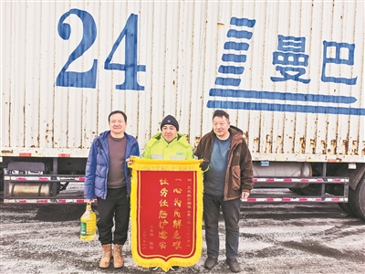 本报精河讯 (记者赛永杰、陈亭、曼热帕·阿迪力江 通讯员马海玲、陈淑娟) 1月29日,精河县托托互通匝道收费站内,来自新疆曼巴物流有限公司的受助货车司机高善明,将一面印着“一心为民解急难 任劳任怨护途安”的锦旗,送到收费员吾斯曼江·吾曼尔手中。
