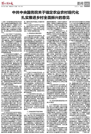 (上接第一版)推动粮食品种培优和品质提升,实施粮食流通提质增效项目,促进适销对路、优质优价。巩固提升大豆产能,做好产销衔接。拓展油菜、花生、油茶等生产空间,扩大油料多元化供给。推动棉花、糖料、天然橡胶等产业平稳发展。深入推进粮食节约和反食品浪费行动。