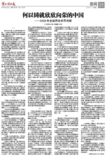 在国际媒体和海外观察家眼中,今年的中国两会“意义格外重大”。十四届全国人大四次会议批准的“十五五”规划纲要,是“世界上最重要的文件之一”,将“深刻塑造未来数年中国的增长、技术创新、民生保障以及国际角色”,也将“深度牵动全球价值链、投资流动乃至整个世界的经济格局”。