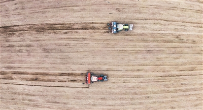 ◀ 3月13日,精河县大河沿子镇呼苏木齐村的农田里,小麦播种机正在穿梭作业(航拍图)。