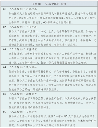 全面实施“人工智能+”行动,加强人工智能同科技创新、产业发展、文化建设、民生保障、社会治理相结合,抢占人工智能产业应用制高点,全方位赋能千行百业。